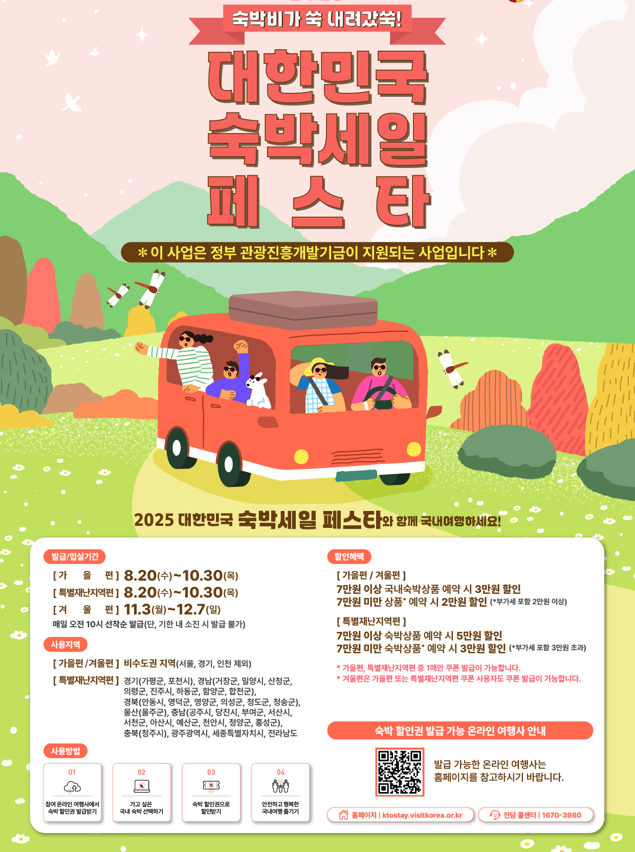 2025년 가을·겨울 숙박 할인 페스타의 일정, 할인 혜택, 신청 방법, 유의사항, 그리고 알뜰하게 이용할 수 있는 팁까지 자세하게 안내합니다.