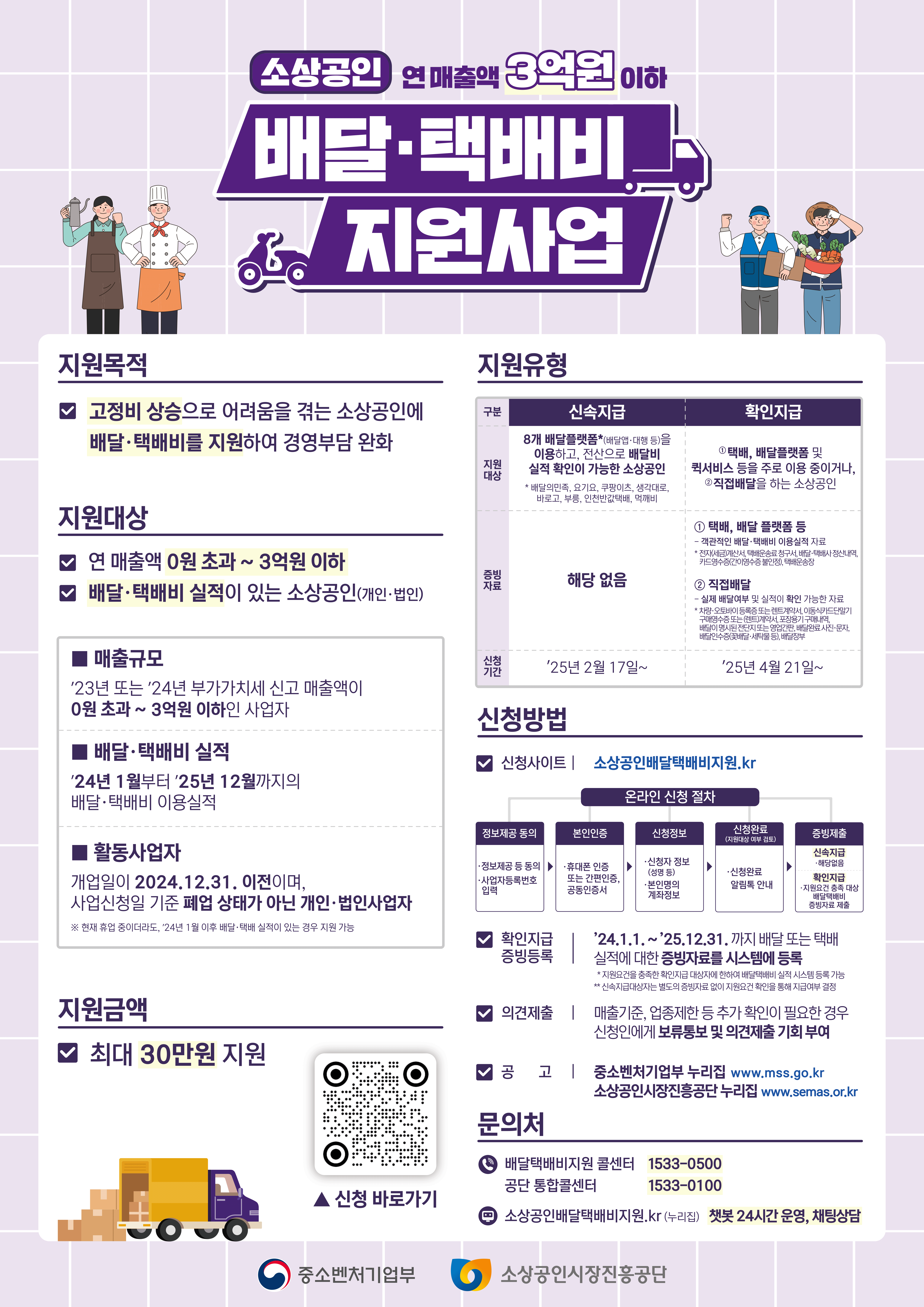 이번 소상공인 배달·택배비 지원사업은 최대 30만 원 한도이지만, 실제 배달대행료를 감안하면 결코 적지 않은 금액이며, 별도의 경쟁평가 없이 자격만 충족하면 신청 가능한 사업입니다.