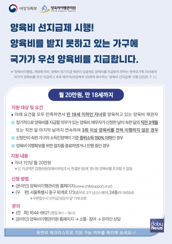 2025년 양육비선지급제는 한부모 가정과 양육비 체납 문제로 어려움을 겪는 부모에게 큰 도움을 주는 정책입니다.
